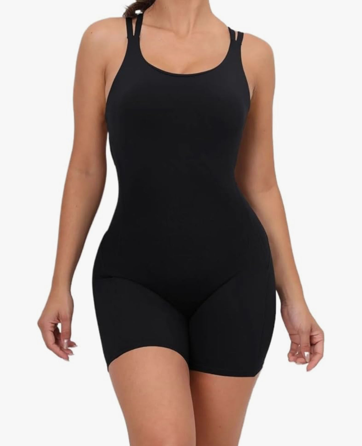 Este enterito corto sin mangas combina comodidad, estilo y discreción en una sola prenda. Su diseño de cuatro tiras que se cruzan en la espalda le da un toque moderno y elegante, ideal para quienes quieren un look diferente sin exagerar.